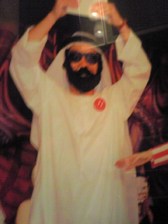 おかんがおやじにドバイ土産に買ってきた衣装に、インキューブで買った750円のヒゲつきサングラスをかけてて、仮装大会見事、準優勝をかざった